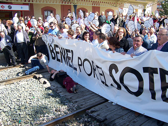Más de 700 ciudadanos de Beniel se han manifestado esta mañana en las calles de la localidad para pedir el soterramiento del Ave. Esta es la cuarta protesta protagonizada por los benielenses y convocada por su alcalde Roberto García Navarro. Tras todas estas manifestaciones el primer edil ha creído necesaria tomar la medida hasta ahora más drástica y cortar las vías del tren en la estación de Beniel, lugar por donde pasará el Ave según el proyecto actual, y conseguir que tanto el gobierno central, como el regional “escuchen a un pueblo, que está luchando por una causa justa, que es la de pensar en el futuro de todos los ciudadanos viven en él”, según García Navarro.