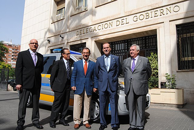 El delegado del Gobierno en Murcia, Joaquín Bascuñana, junto con el jefe provincial de Tráfico, Víctor Sales, ha hecho entrega hoy a los municipios de Abanilla, Beniel, Santomera y Fortuna, de un vehículo de la Jefatura Provincial de Tráfico de Murcia, el cual servirá de apoyo a la Policía Local de estos municipios en las labores de vigilancia de la seguridad vial.