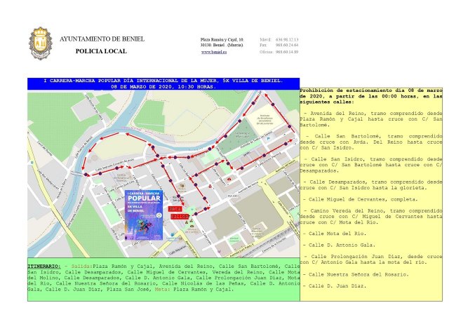 Durante el domingo 08 de marzo del 2020 se modifica la regulación del tráfico debido a un nuevo evento deportivo que se desarrolla en el municipio. En esta ocasión se realiza la I Carrera - Marcha Poular 5K "Villa de Beniel" - Día Internacional de la Mujer.