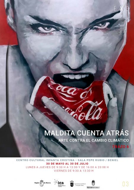 Por su parte, el Ayuntamiento de Beniel seleccionó el proyecto 'Maldita cuenta atrás', de Grupo Trazo6, que reúne obras pictóricas de los artistas María José Caride, Santi García Cánovas, Domingo Martínez Garrido, Carlos Menéndez, Antonio Pellicer, Gelu Pérez Soto y Manuel Vacas que buscan concienciar con el arte sobre el cambio climático y la necesidad de una visión ecológica y sostenible de nuestro entorno. Esta exposición podrá visitarse en el Centro Cultural Infanta Cristina desde el 30 de mayo al 30 de julio. Los horarios de visita son de lunes a jueves de 9:30 a 13:30 horas y de 16:00 a 20:00 horas, así como los viernes de 9:30 a 13:30 horas.